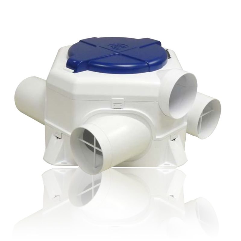 Вентилятор состоит из пластикового корпуса с четырьмя всасывающими патрубками и одним нагнетательным, все патрубки имеют диаметр 125 мм. В комплекте с вентилятором поставляются три заглушки, которыми можно закрыть всасывающие патрубки, если нет необ- ходимости использовать все четыре вытяжных канала.