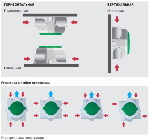 Вентилятор состоит из пластикового корпуса с четырьмя всасывающими патрубками и одним нагнетательным, все патрубки имеют диаметр 125 мм. В комплекте с вентилятором поставляются три заглушки, которыми можно закрыть всасывающие патрубки, если нет необходимости использовать все четыре вытяжных канала.