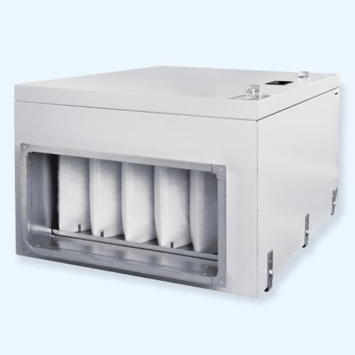 Приточная установка оснащена фильтром класса G4, электрическим нагревателем и вентилятором. Установка оборудована электронно-коммутируемым ЕС двигателем. Защита двигателя вентилятора осуществляется встроенными термоконтактами. Трехфазные электрические нагреватели оснащены двухступенчатой защитой от перегрева. Первая ступень настроена на +60°С и перезапускается автоматически, вторая ступень настроена на +110°С и перезапускается вручную.