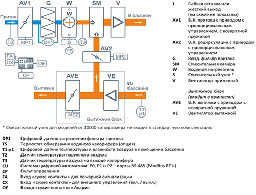 Приточно-вытяжная установка Aqua Pool Mix комплектуется вентиляторами EBMPapst серии EC, системой автоматики JetLogic с цветным сенсорным пультом управления и всеми необходимыми датчиками, а также камерой смешения, позволяющей снижать влажность в помещении бассейна дозированной подачей сухого наружного воздуха. Эта серия отличается низкой стоимостью и рекомендуется для регионов с умеренным климатом.